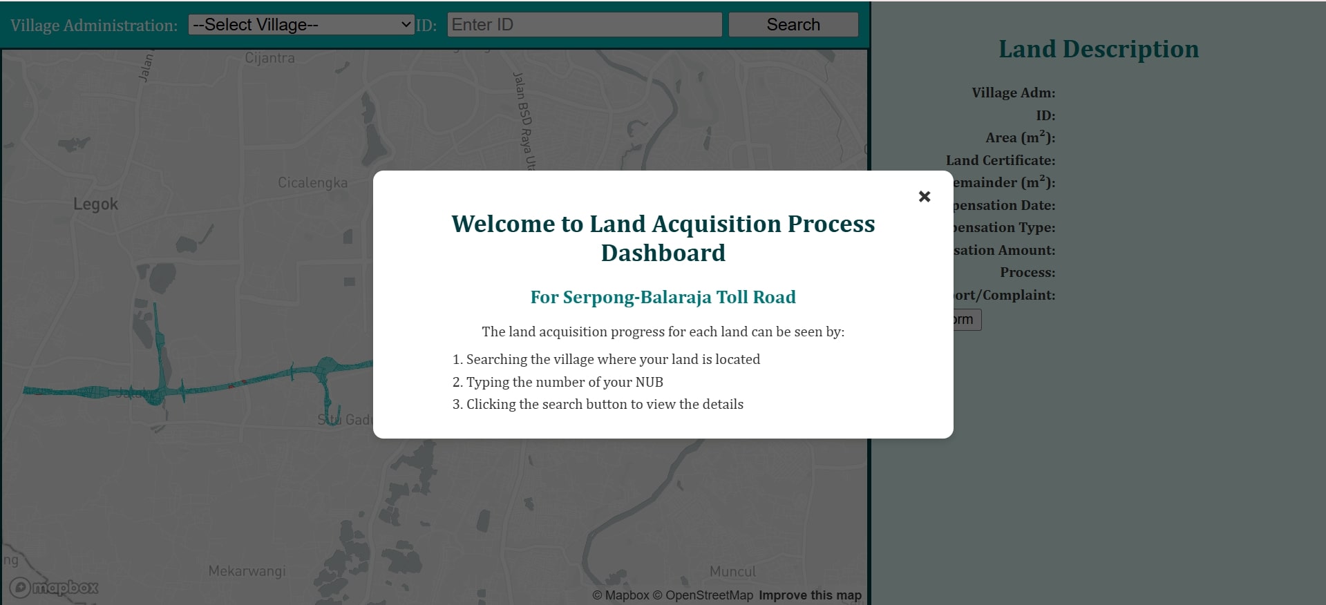 I designed and developed a minimalist land acquisition dashboard to support toll road development in Indonesia, with a focus on accessibility for underserved and elderly populations. Built using ArcGIS and JavaScript, the dashboard visualizes parcel-level land acquisition progress and provides a simple interface for users to access information, report issues, and track updates in real time. The tool was designed to improve transparency, reduce communication gaps between communities and project stakeholders, and ensure that residents, especially those with limited digital literacy, could engage meaningfully in the acquisition process.