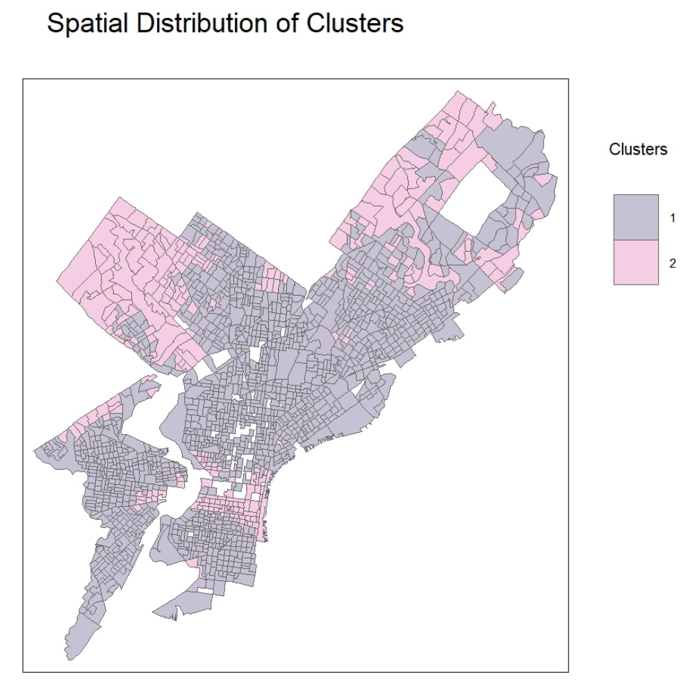 Using K-means clustering, this report categorized Philadelphia neighborhoods based on standardized socioeconomic and housing attributes, including income, education, vacancy, and housing type. The analysis identified natural groupings that reflect spatial and economic divisions across the city. Through iterative validation and visualization, the study demonstrated how clustering can uncover hidden patterns and inform data-driven neighborhood planning strategies.