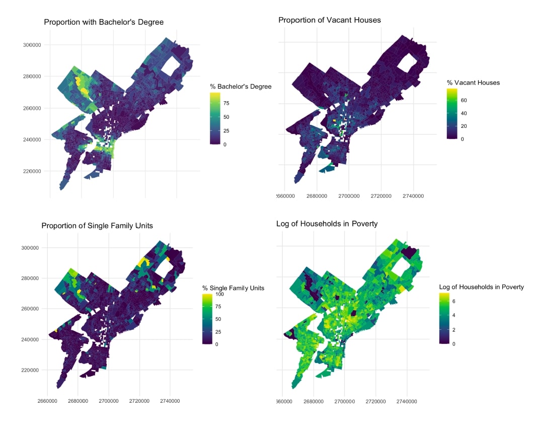 This report developed an Ordinary Least Squares (OLS) regression model to predict median house values across Philadelphia’s block groups using socioeconomic and housing indicators such as poverty rate, educational attainment, vacancy rate, and proportion of single-family homes. The study emphasized model diagnostics, regression assumptions, and validation through stepwise regression and cross-validation, providing an evidence-based understanding of neighborhood characteristics influencing property values.